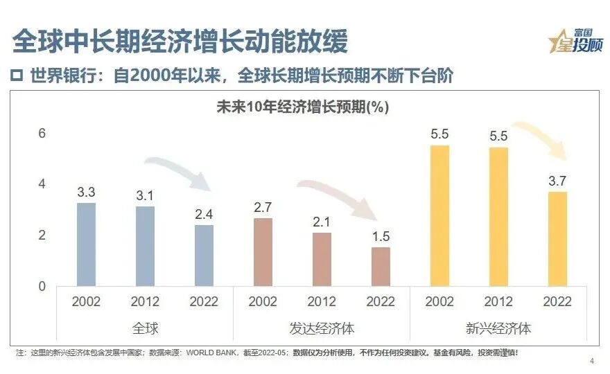 全球中长期经济增长动能放缓。自2000年以来,全球长期增长预期不断下台阶,如果说通胀是海外流动性紧张的推手,那增长疲软就是远方的约束。通胀不仅反噬经济,也会给全球资产带来巨大挑战。