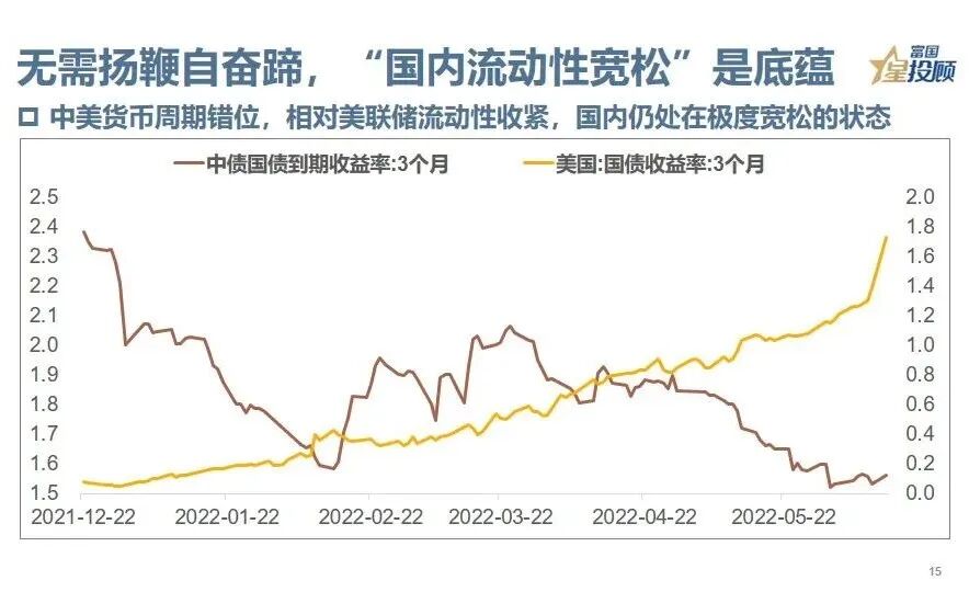 无需扬鞭自奋蹄,“国内流动性宽松”是底蕴。中美货币周期错位,相对美联储流动性收紧,国内仍处在极度宽松的状态。所谓水涨船高,对于国内资产,这是极好的礼物。这也是为什么,A股能抗住美联储加息缩表的压力测试,国内债券能够在全球债市中一种独秀。