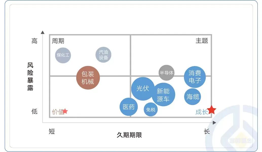 从自上而下的角度出发,根据当前经济所处景气位置以及流动性环境等因素,以风险暴露为Y轴、投资久期为X轴。将投资标的划分为周期、价值、成长和主题四大类。