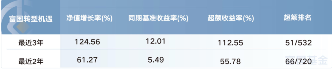 富国转型机遇近3年、近2年、近1年均的超额收益分别为 112.55%、55.78% ,超额排名在同类强股混合型基金中居前10%。