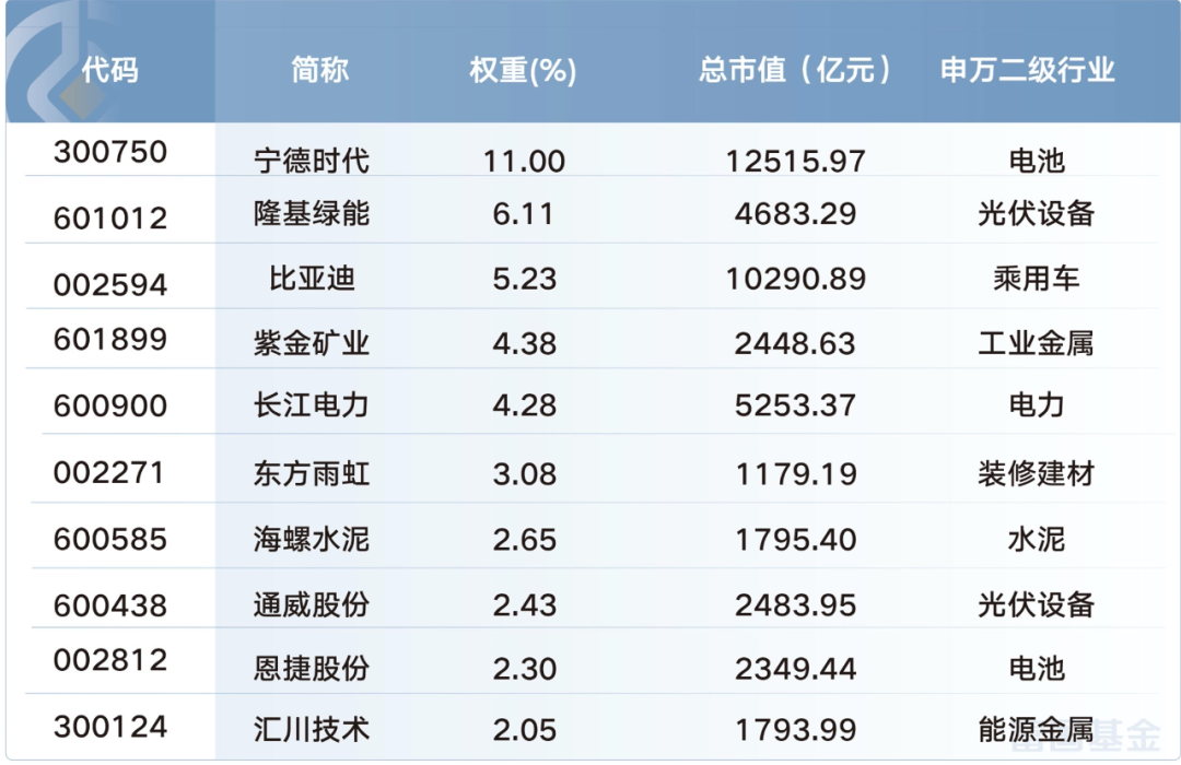 注:数据来源:中证指数公司官网,Wind;2022年6月22日;行业分类为申万一级行业,行业数据可能根据指数编制方案调整。 整体市值风格偏大盘,对发展确定性更高的行业龙头赋予更大权重。截至2022年6月23日,100只成分股总市值合计超 10万亿元 ,32只成分股总市值超1000亿元。其中,包括 宁德时代、比亚迪 等市值超万亿元的大市值公司 ,以及 长江电力、隆基绿能、通威股份、海螺水泥、紫金矿业、恩捷股份等细分领域龙头公司 。
