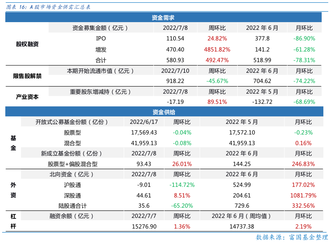 资金需求方面,本周一级市场规模有所增加,限售股解禁压力上行,重要股东增持。本周一级市场资金募集金额合计580.93亿元,较上周大幅增加492.47%;结构上,IPO募集110.54亿元,周环比增加24.82%;增发募集470.40亿,周环比增加4851.82%。本周限售股解禁规模合计918.22亿元,周环比减少45.67%,根据目前披露的数据,预计下周解禁规模约918.22亿元,解禁压力有所上行。本周重要股东减持17.19亿元,上周减持145.93亿元。