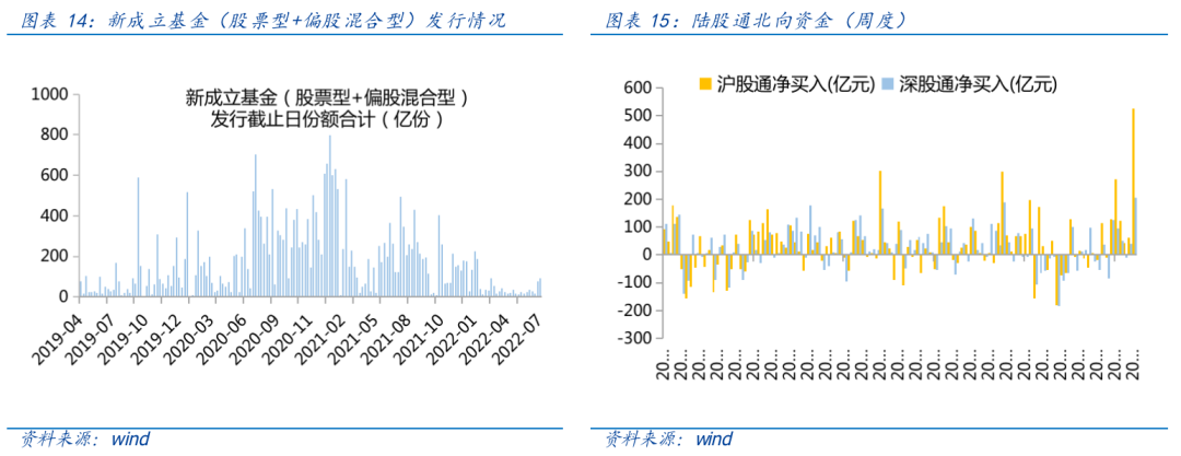 资金供给方面,本周基金发行增加,北向资金继续净流出。本周北向资金净流入35.6元,较上周减少65.20%,其中沪股通净流出9.01亿元,深股通净流入44.61亿元。本周新成立股票型及偏股混合型基金份额合计93.43亿份,环比增加26.01%,显示基金发行火热。本周开放式公募基金份额较稳定,其中股票型份额几乎保持不变为17567.43亿份,混合型份额几乎保持不变为41959.13亿份。
