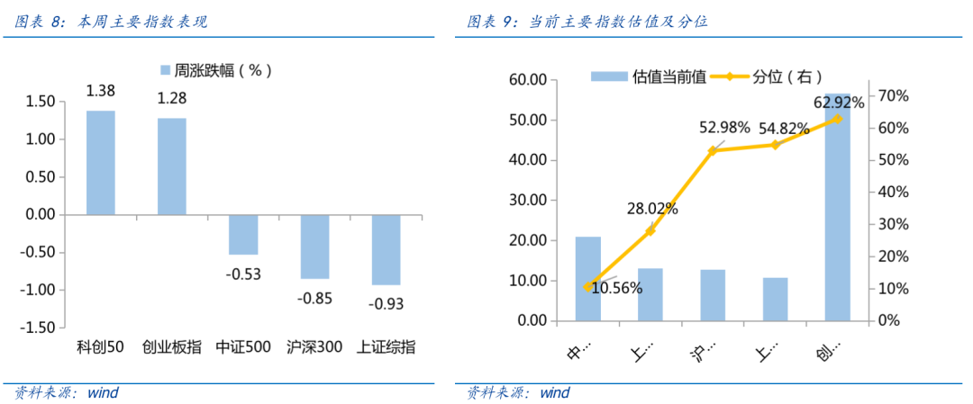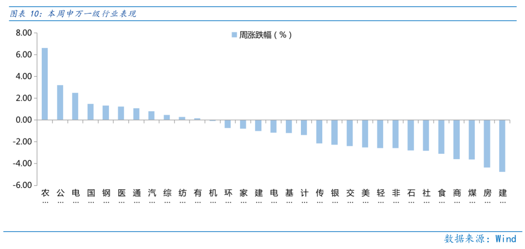 近一周,上证指数上涨1.38%,创业板指下跌0.85%,沪深300下跌0.53%,中证500下跌0.93%,科创50上涨1.28%。风格上,稳定、成长表现相对较好,金融、消费表现较差。从申万一级行业看,表现相对靠前的是农林牧渔(6.63%)、公用事业(3.19%)、电力设备(2.51%)、国防军工(1.49%)、钢铁(1.34%);表现相对靠后的是建筑材料(-4.76%)、房地产(-4.36%)、煤炭(-3.63%)、商贸零售(-3.58%)、食品饮料(-3.11%)。