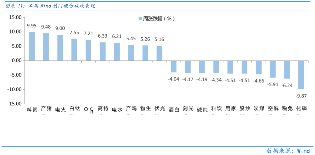 本周市场震荡,受生猪价格上涨及汽车消费回暖影响,相关板块整体领涨。从Wind热门概念板块来看,表现相对靠前的是饲料(9.95%)、猪产业(9.48%)、火电(9%)、钛白粉(7.55%)、CRO(7.21%);表现相对靠后的是磷化工(-9.87%)、免税店(-6.24%)、航空运输(-5.91%)、煤炭开采(-4.66%)、炒股软件(-4.51%)。