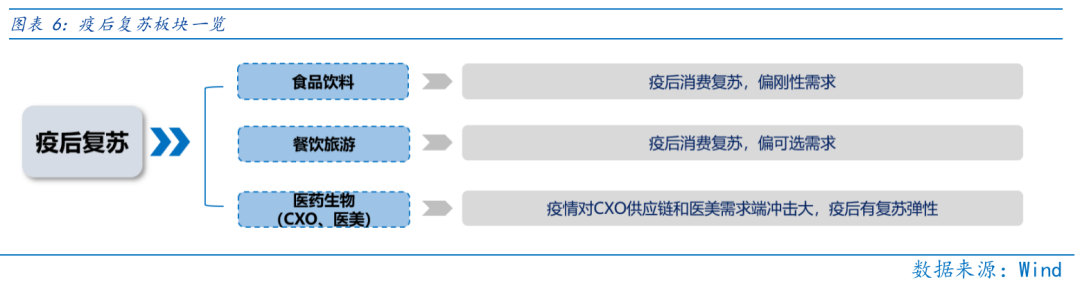 疫后复苏板块:受益疫情趋缓,且整体反弹力度较小有补涨动能,主要是食品饮料、医药生物(CXO、医美)、社会服务等行业。