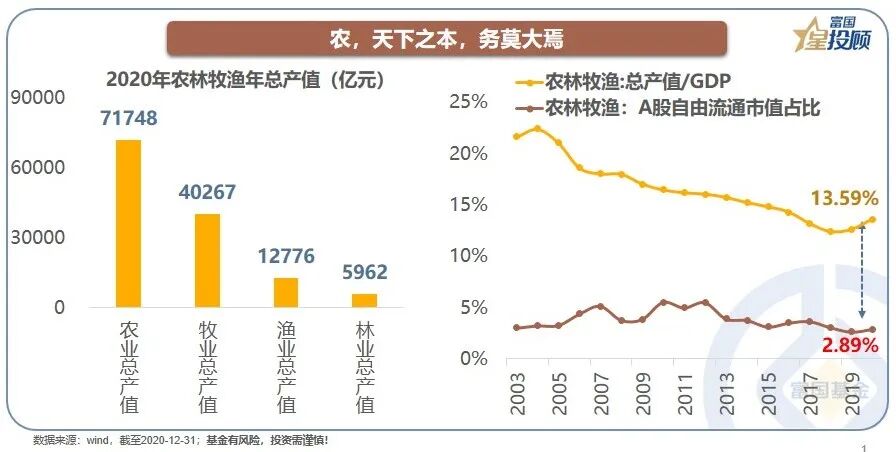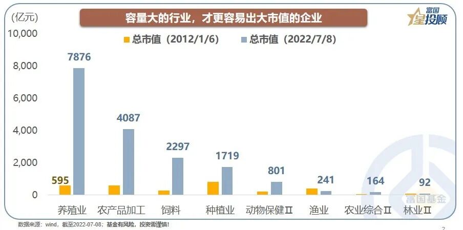 肥沃的土壤才能长出参天大树,容量大的行业更易出大市值企业。容量大的行业,天花板高、故事性强,更为资本市场青睐。在农、林、牧、渔中,农业和牧业的总产值较大,所以,尽管农业产业链长、子行业众多,但在市值规模上:养猪的是“诸侯”;做农产品加工的是“大哥”;游走的扇贝和不靠谱的存货,只能让渔业当“小兵”。