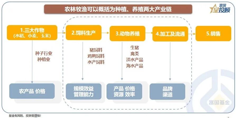 农林牧渔到底在研究什么?农业的本质是通过光合作用,将太阳能转化为植物蛋白,再部分转化为动物蛋白,从田园到餐桌,满足消费者需求的过程。从有限的生产资料,到自身的生产周期,再到终端的消费品,农林牧渔行业具备“消费+周期+成长”三重属性。若从内涵看,可以概括为种植、养殖两大支柱产业链。