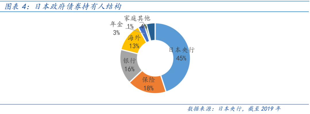 日本是政府债券规模占GDP比重最高的国家,225%的政府杠杆率远高于欧债危机初期希腊的133%。但从持有人结构来看,欧洲各国的国债海外持有占比大多在 20%以上。而日本国债约80%由日本央行和本国金融机构持有,以配置型资金为主,海外持有比例仅为13%。此外,日本央行在YCC计划下承担“最后购买者”的角色,以固定价格无限量购买债券,是国债市场实力强大的稳定器。