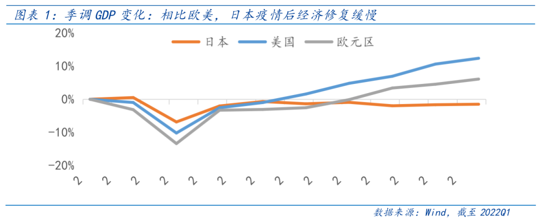 与欧美国家面对的高通胀不同,日本在经济低迷+低通胀+高债务的组合下,提振经济,摆脱通缩,减轻政府利息支付压力的需求导致对宽松货币政策的依赖度较高。截至2021年,日本政府债务占名义GDP比重高达225%,居全球首位。自新冠疫情以来,日本经济受到重创后修复缓慢,需要继续维持宽松刺激经济。