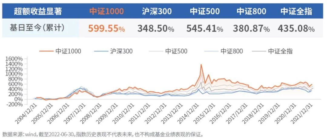 ● Wind数据显示,自2004年12月31日基日以来,截至2022年6月30日,指数累计上涨599.55%,远超同期沪深300、中证500、中证800、中证全指的表现。