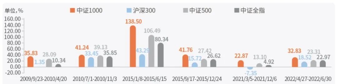 ● 在市场反弹的时候,中证1000指数收益的爆发性较强,阶段性收益明显强于其他主流指数