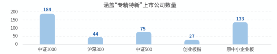 ● 2021年以来,对培育和支持“专精特新”企业的表述及政策出台十分密集,“专精特新”企业政策倾斜明显。中证1000的成分股中,现有184家“专精特新”企业,相较于沪深300(44家)、中证500(75家)、创业板指(27家)、原中小企业板(133家)等宽基指数,“专精特新”数量优势明显。