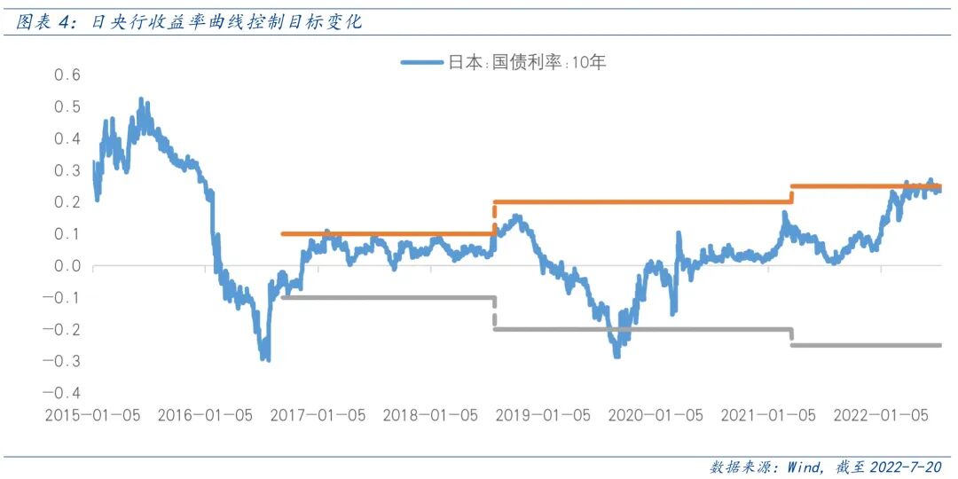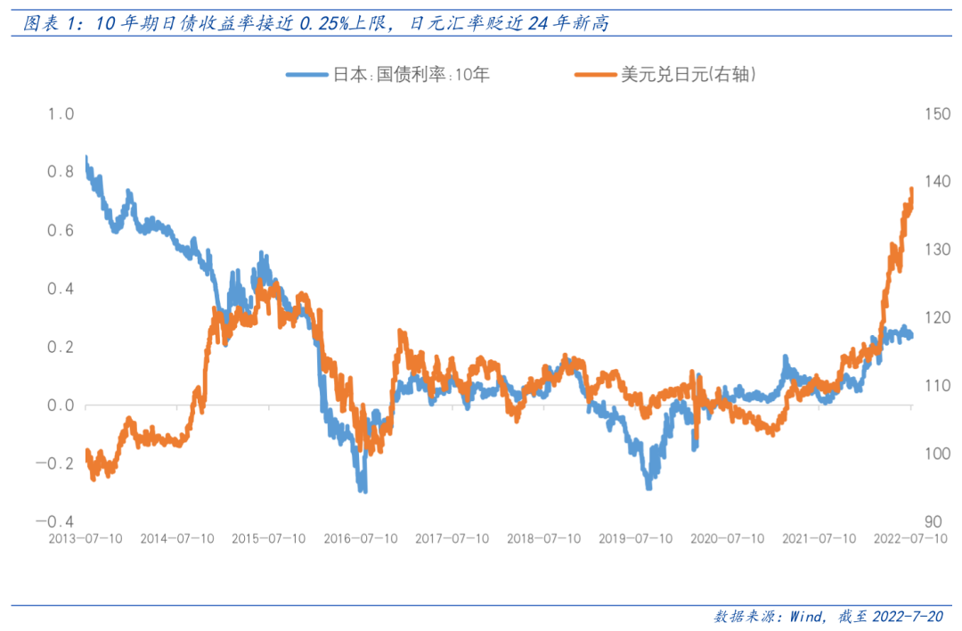 今年以来,在全球主要央行紧缩背景下,日本央行选择维持超宽松货币政策以及日本较弱的经济增长预期导致日元大幅贬值。7月14日美元兑日元汇率突破139,创下近24年新高。当前日本央行为了刺激经济持续复苏,通过无限量购债将10年国债利率控制在0.25%以下,但较高的成本和汇率进一步贬值压力让市场开始预期鸽派政策可能出现调整。