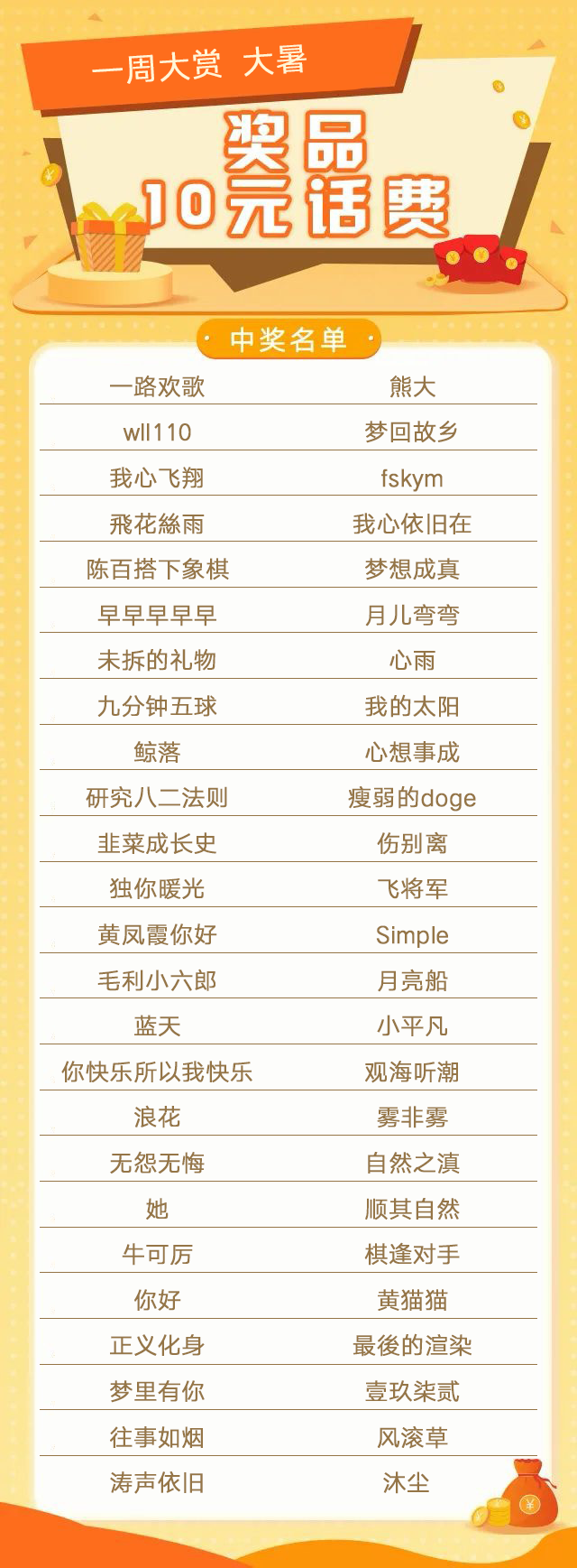 小编将于后台联系获奖的客官,话费将于7月29日(本周五)前充值到中奖客官的手机号码中,请各位客官耐心等待~