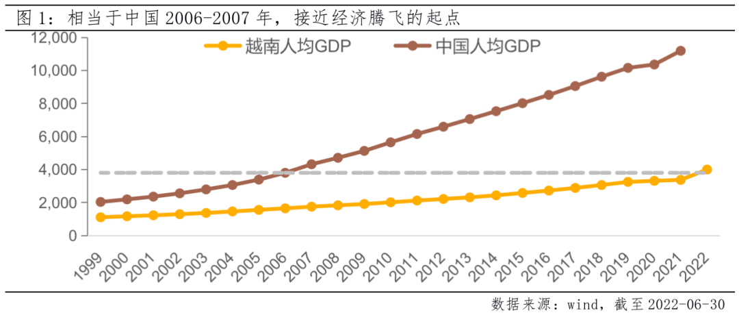 从人均GDP角度衡量,当前越南人均GDP为3700美元,IMF预计到2022年底越南人均GDP将达到4120美元,整体相当于中国2006-2007年经济腾飞的起点;从城镇化率的角度,也大致与2000年的中国相当。