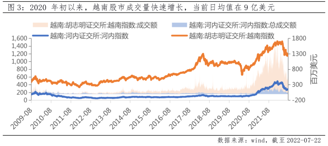 截至2022年4月底,越南股市总市值2343亿美元,约占GDP的90%,上市企业超2100 家。与早年A股类似,越南市场仍以散户交易为主,账户数占90%以上,散户成交占比50%以上。2020~2022年初,凭借着越南经济持续稳健的亮眼表现,越南胡志明指数上涨 55%,河内指数上涨360%,实现了靓眼涨幅。但2022年以来,在欧美“高通胀”及紧缩政策冲击下,越南股市出现大幅波动下跌,目前股票平均市盈率在13倍左右,企业估值相对具有较大吸引力。从长期角度看,如果投资越南,正如投资当年的中国,那确实意味着这是一个长达十余年的经济体高增速的投资机会,当前仍然是具有价值的投资时点。