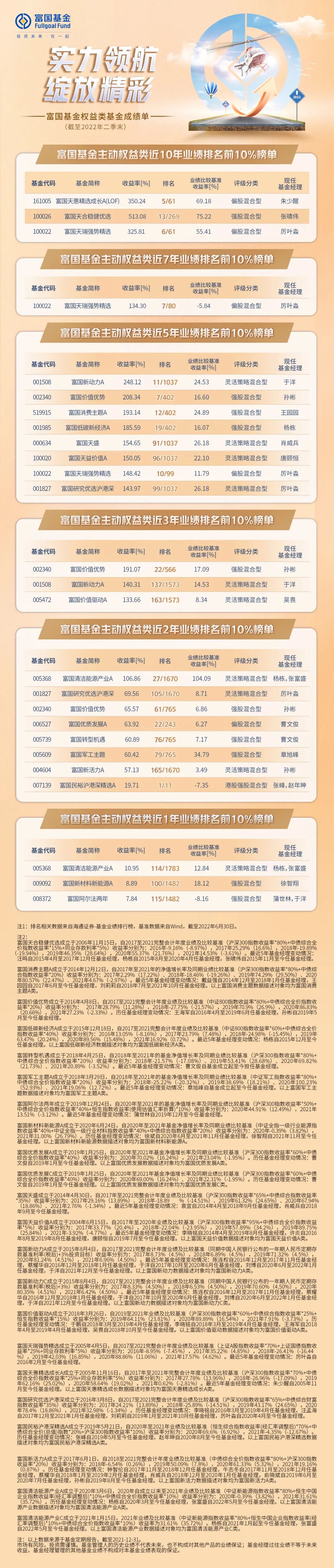 海通证券最新发布的《基金业绩排行榜》、《基金公司权益及固定收益类资产业绩排行榜》数据显示,截至6月30日,富国基金旗下权益基金近10年的绝对收益率为340.33%,在11家权益类大型基金公司中位居第4,长跑实力凸显;固定收益类基金近2年绝对收益率为9.79%,在14家固收大型基金公司中位居第3;此外,富国基金旗下多只基金近年来业绩跻身同类前列,股债业绩呈现多点开花的局面。
