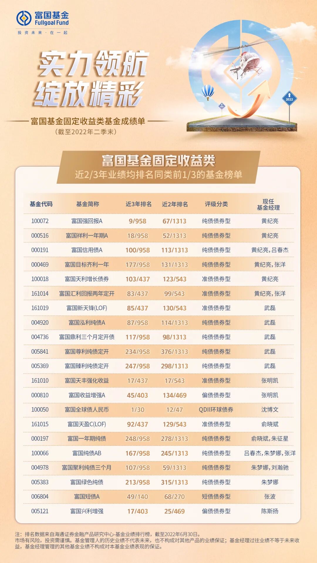 截至2022年6月30日,富国基金旗下有多达21只固收类产品近2年、近3年均排名同类前1/3。其中,由富国基金总经理助理、固定收益投资部总经理黄纪亮亲自担纲的富国强回报A,近2年、近3年收益率排名同类纯债债券型基金前5%(67/1313,9/958);另有由他与吕春杰共同掌舵的富国信用债A近2年、近3年表现同样不俗,收益率位列同类纯债债券型基金回报前10%(113/1313,100/958)。