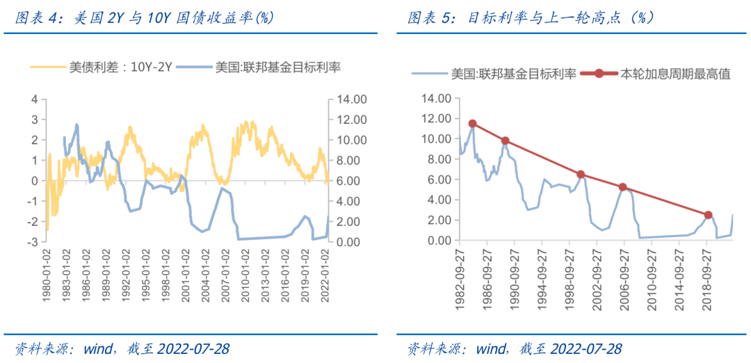 特别是美国十年期国债收益率在6月14日达到高点3.49%之后,不仅没有随着本次加息而有所走高,相反进一步回落至7月28日的2.68%。这意味着即使美联储9月再次加息75个基点,美国十年期国债收益率也难以突破3.5%,反应出市场对未来加息的担忧下降。