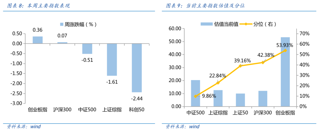 近一周,上证指数下跌0.51%,创业板指下跌2.44%,沪深300下跌1.61%,中证500上涨0.07%,科创50上涨0.36%。风格上,周期、成长表现相对较好,稳定、消费表现较差。从申万一级行业看,表现相对靠前的是煤炭(4.81%)、房地产(4.62%)、石油石化(2.85%)、机械设备(2.61%)、美容护理(2.46%);表现相对靠后的是医药生物(-1.57%)、公用事业(-1.11%)、电力设备(-1.09%)、通信(-0.92%)、钢铁(-0.74%)。