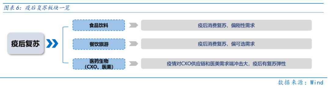 疫后复苏板块:受益疫情趋缓,且整体反弹力度较小有补涨动能,主要是食品饮料、医药生物(CXO、医美)、社会服务等行业。