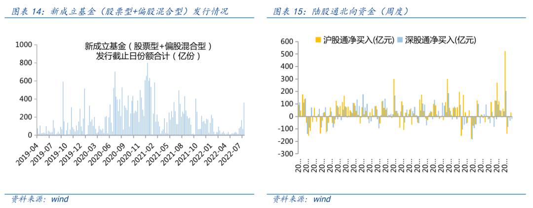 资金供给方面,本周基金发行增加,北向资金净流入。本周北向资金净流入11.48亿元,较上周增加130.72% ,其中沪股通净流入31.78亿元,深股通净流出20.3亿元。本周新成立股票型及偏股混合型基金份额合计11.48亿份,环比增加130.72% ,显示基金发行火热。本周开放式公募基金份额较稳定,其中股票型份额几乎保持不变为17775.56亿份,混合型份额几乎保持不变为40199.79 亿份。
