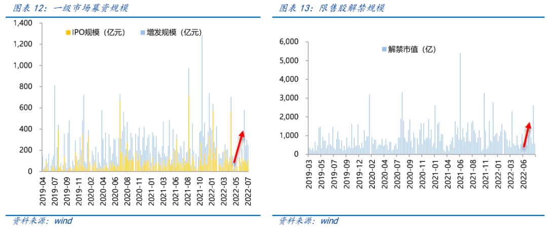 资金需求方面,本周一级市场规模有所减少,限售股解禁压力上行,重要股东减持。本周一级市场资金募集金额合计252.71亿元,较上周减少15.66% ;结构上,IPO募集107.83亿元,周环比增加88.55% ;增发募集144.88亿,周环比减少40.24% 。本周限售股解禁规模合计584.35亿元,周环比减少77.64% ,根据目前披露的数据,预计下周解禁规模约731.24亿元,解禁压力有所下行。本周重要股东减持64.5亿元,上周减持90.58亿元。