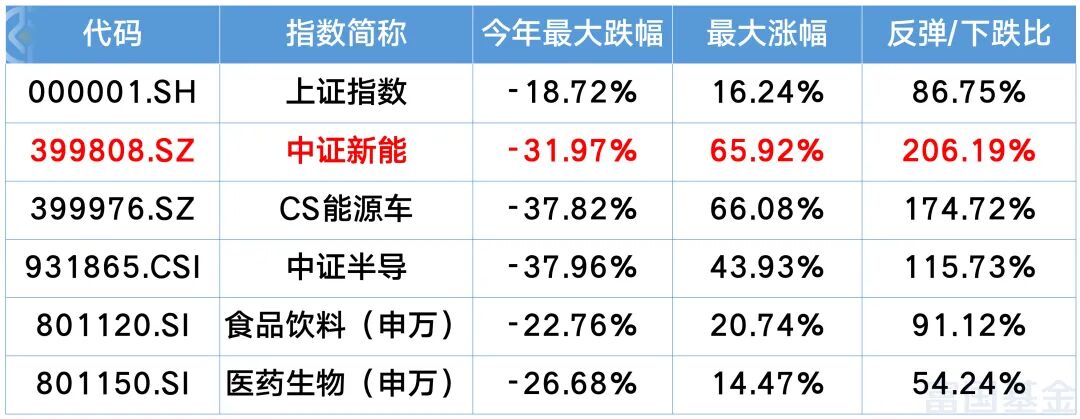 富二统计了一下具有代表性的各板块年内的反弹/下跌比,新能源以超2倍的反弹/下跌比遥遥领先消费、医药等板块,无疑成为结构性行情中最亮的星,而新能车和以半导体为代表的电子行业反弹/下跌比也有相对优势。