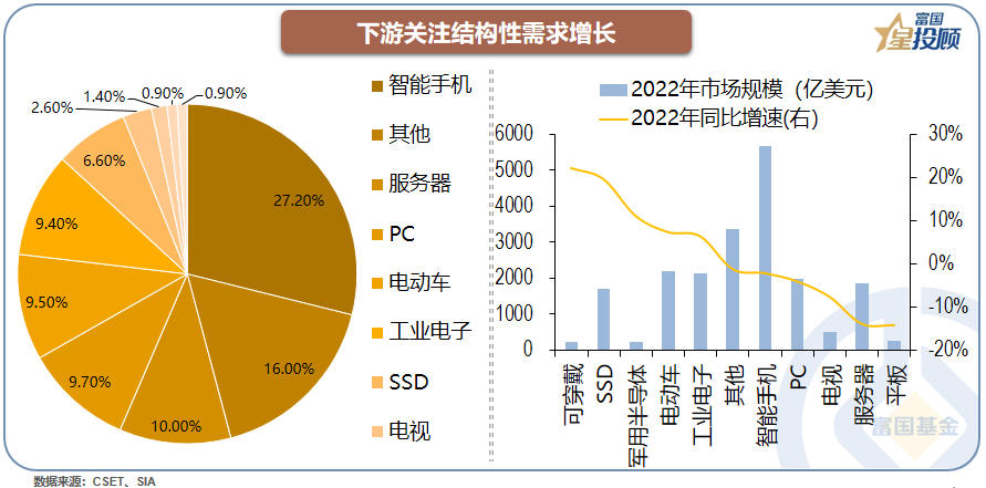 智能手机是半导体下游最大需求,但今年面临放缓的压力,而可穿戴设备、SSD、军工半导体、电动车成为下游需求增长的主要推动力。在半导体下游需求中,智能手机、服务器和PC占比前三,分别为27.2%、10%和9.7%。由于占比最高的智能手机今年市场规模增速放缓至-2%,因此今年半导体行业整体景气度较低。在整体“弱景气”的背景下,可穿戴设备、SSD、军用半导体、电动车行业的结构性机会值得关注。