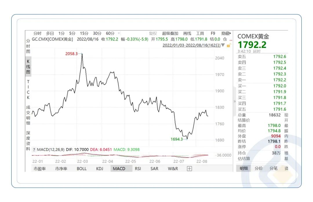 老话说“盛世古董,乱世黄金”,今年以来国际大事不断,国际黄金价格可以说是坐上了“过山车”。年初至今,国际金价最高价出现在俄乌冲突引发的地缘政治紧张时期,而后国际金价从2050美元/盎司至跌破1700美元/盎司关口,这正是美联储加息和加息预期施压的结果。7月中旬以来美元指数大幅回落,黄金价格明显反弹,也体现了避险需求的持续上涨。