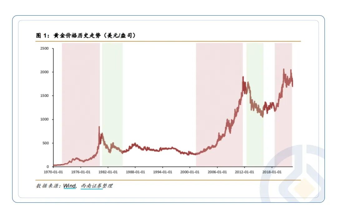 第一轮,1972-1980年,随着布雷顿森林体系解体,美元放弃金本位,黄金与美元脱钩,叠加地缘冲突、石油危机、美元贬值、全球经济增速放缓等因素,共同驱动了金价上涨。
