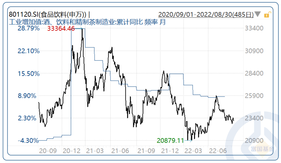 工业增加值有41个工业细分行业,我们拿占消费行业权重较大的“酒、饮料和精制茶制造业”这一细分来看,可发现其累计同比增速与申万食品饮料指数存在较强的相关性。当前值是是处于2020年疫后恢复以来“趴在低点”的位置,折射出了行业在疫情反复冲击的阵痛中强劲的韧性。