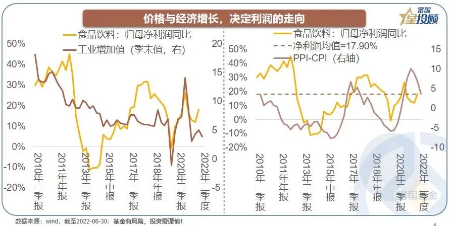 盈利是资产定价的核心。每一个阶段,行业总会有不同的矛盾,但体现在股价的变动趋势上,却有高度的一致性特征,即净利润增速是资产定价的核心驱动。基于食品饮料行业净利润增速的长期“稳健”,市场给出了明显的确定性溢价和估值溢价。所以,每逢市场波动,食品饮料行业都会表现出明显的避险属性。