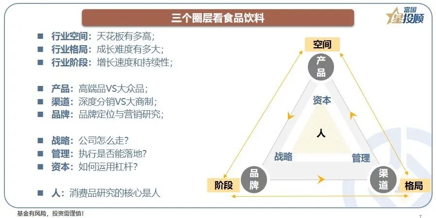 如何找寻超额收益?三个圈层看食品饮料。第一个圈层,优选好行业。空间、格局、阶段决定了股价的天花板;第二个圈层,选好公司。产品、品牌、渠道,决定了股价的持续性。第三个圈层,选优秀的管理层。战略、管理、资本,决定了股价的长期可复制性。