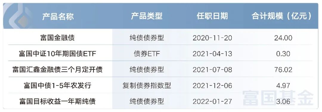 ● 2019年8月加入富国基金,历任固定收益基金经理助理,现任富国基金固定收益投资部固定收益基金经理