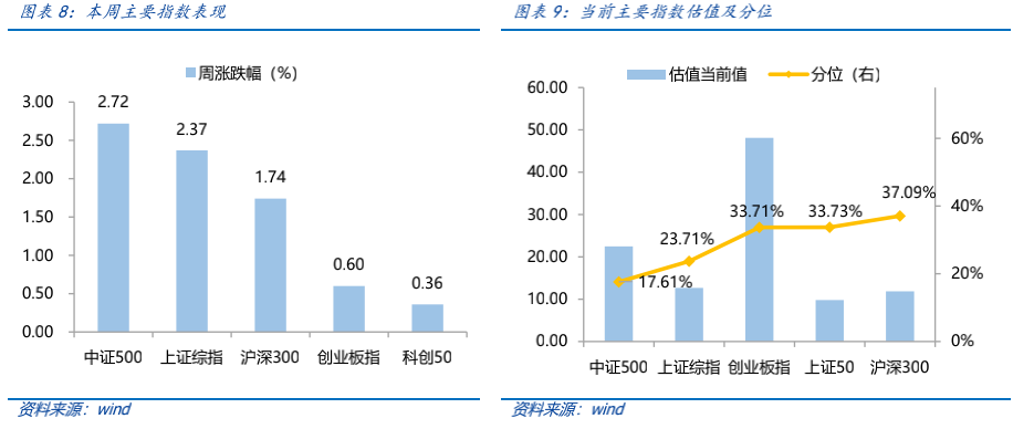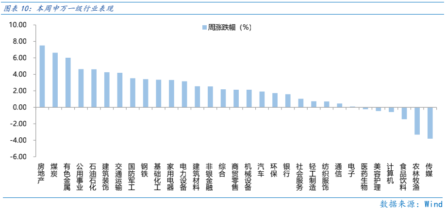 近一周,上证指数上涨2.37%,创业板指上涨0.6%,沪深300上涨1.74%,中证500上涨2.72%,科创50上涨0.36%。风格上,稳定、周期表现相对较好,消费、成长表现较差。从申万一级行业看,表现相对靠前的是房地产(7.51%)、煤炭(6.63%)、有色金属(6.02%)、公用事业(4.64%)、石油石化(4.62%);表现相对靠后的是传媒(-3.8%)、农林牧渔(-3.31%)、食品饮料(-1.44%)、计算机(-0.57%)、美容护理(-0.45%)。
