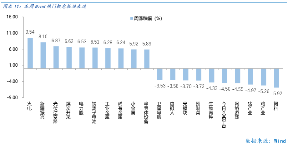 本周煤炭业绩中枢抬升,盈利增速维持高位,相关板块受益领涨。从Wind热门概念板块来看,表现相对靠前的是火电(9.54%)、新疆振兴(8.1%)、光伏逆变器(6.87%)、煤炭开采(6.62%)、电力股(6.53%);表现相对靠后的是饲料(-5.92%)、鸡产业(-5.26%)、猪产业(-4.97%)、网络游戏(-4.55%)、今日头条平台(-4.5%)。