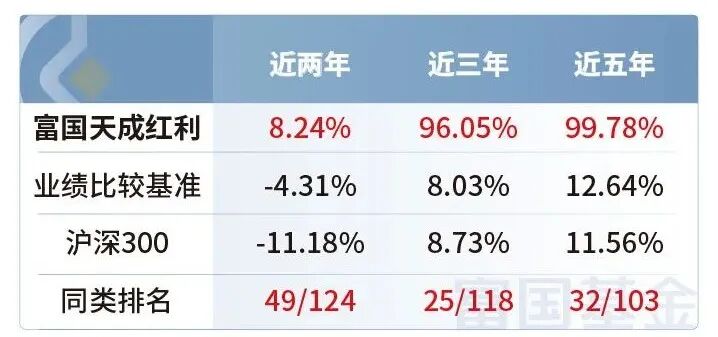 侯梧说,他的投资目标比较实在,希望每年都能做到同类前1/3。而其管理时间最长的富国天成红利(代码:100029)近三年同类排名前1/4(25/118),超越了自己的小目标。富国天成红利近两年、近三年、近五年净值增长率分别为8.24%、96.05%、99.78%,同期业绩比较基准收益率分别为-4.31%、8.03%、12.64%,超额收益显著。