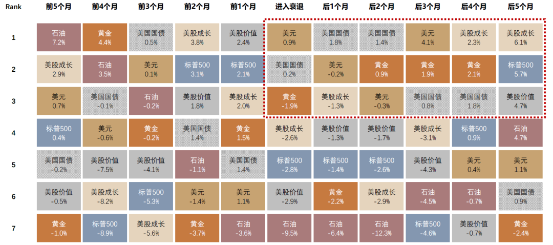 历史上大类资产衰退前后月内收益排序(中位数)