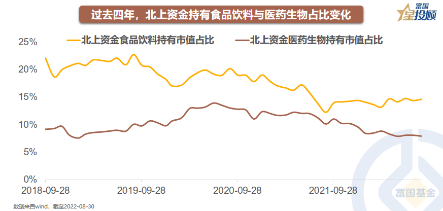 如果对比2022年8月30日和2022年6月30日北上资金持股数据,陆股通在电力设备行业的持有市值增加约569亿元,食品饮料增加约418亿元,而医药生物下降约155亿元。陆股通的持股市值,尽管会体现股票价格变动的因素,但也是北上资金行为的显著变化。目前,食品饮料是北上资金持有市值第二大的行业,仅次于电力设备;但电力设备处于景气的高位,食品饮料则处于景气的低位。陆股通持有食品饮料行业的占比已经从前期12.17%低点,上修至今年8月底的14.56%;持有医药生物的市值占比8月份微幅下滑至7.87%。