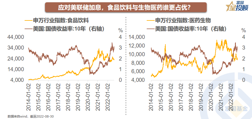 如果美债收益率反映美联储加息与海外风险的话,食品饮料与美债收益率负相关的关系较医药生物更弱。未来即便美联储进一步加息,食品饮料行业抗风险的能力相对更强。