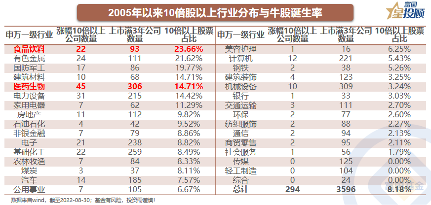 俗话说,宁要三年一倍的增长,不要一年三倍的收益。在所有上市满三年的3596家公司中,2005年以来(2005年以后为上市以来)涨幅满10倍的公司共有294只,A股整体10倍股的占比约为8.18%。食品饮料、有色金属、国防军工、建筑材料、医药生物为牛股诞生率与存活率最高的五大行业。