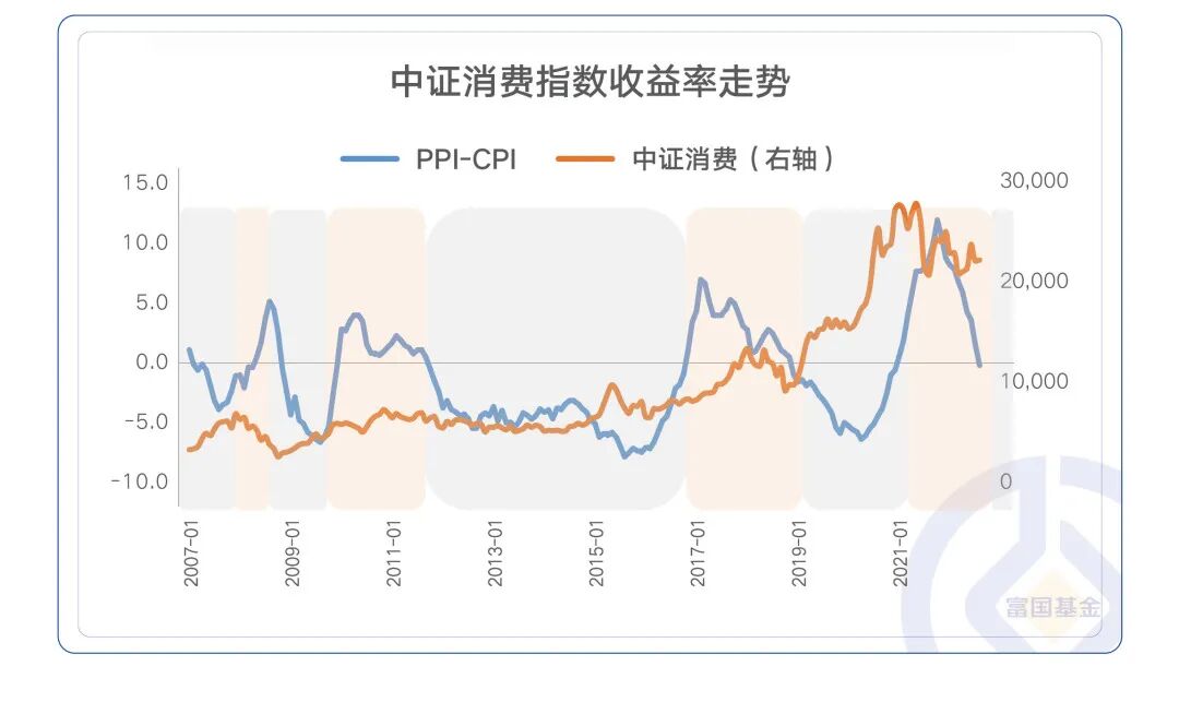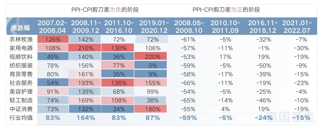 ◆ 复盘历史上四次PPI-CPI剪刀差为负的时候,消费表现亮眼,中证消费指数涨幅均值为105%。这是因为上游企业成本承压、利润受损,而中下游企业在利润传导的过程中盈利得到改善,使得消费企业二级市场表现较好。