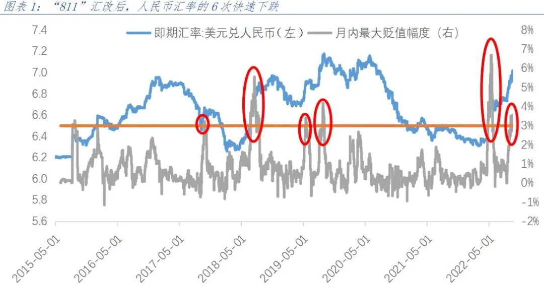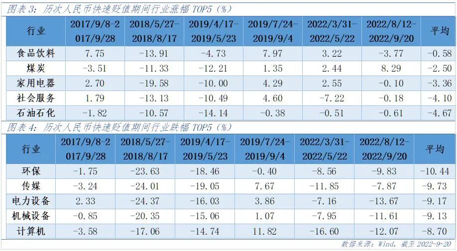 从8月11日至今,美元兑人民币汇率已大幅上涨4.8%,离岸、在岸人民币突破7的重要心理关口。回顾历史上人民币快速贬值阶段,哪些行业板块配置价值较高?