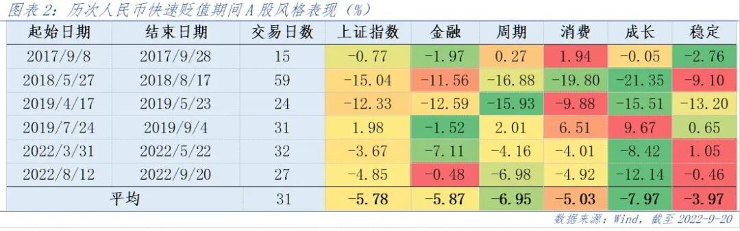 从风格来看,稳定和消费风格表现相对占优,平均跌幅小于上证指数,周期和成长风格表现相对落后,其中成长风格表现最差。在2019年8月的人民币贬值期间,国内经历了LPR改革和货币政策宽松,A股呈现上涨行情,成长风格表现强势。在8月12日以来本轮人民币快速贬值期间,金融和稳定风格表现较好,回撤在0.5%以内,而成长风格跌幅高达12.14%。