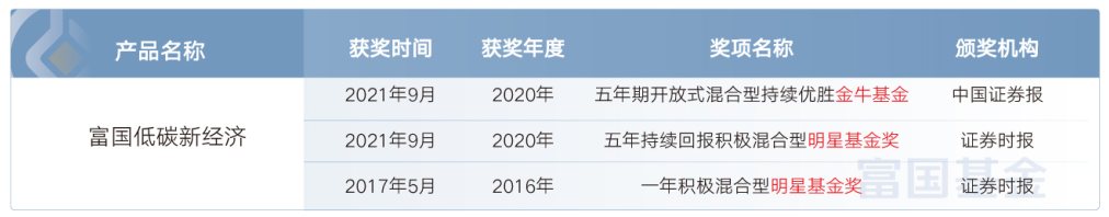 富国低碳新经济于近年荣获《中国证券报》、《证券时报》颁发的多项奖项。