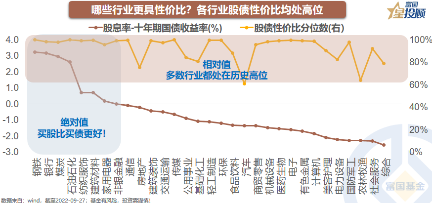 “股债性价比”角度:谁更具性价比?今年的行情在行业上比较极致:要么是买“高景气”,要么是买更便宜或“高分红”。这在“股债性价比”的角度有所体现:比如煤炭、钢铁、石油石化、家用电器等股息率与十年期国债收益率之差为正,买股票比买债券更优。此外,几乎所有行业的“股债性价比”都处在历史高位,中周期股票更具吸引力。