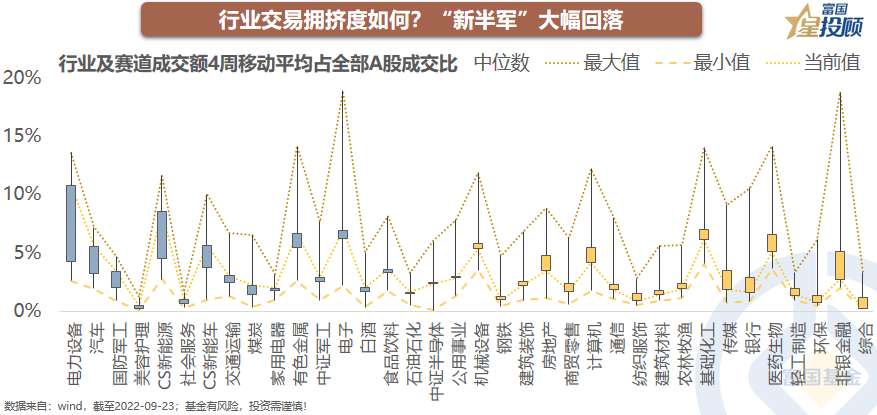 交易拥挤度,已不再是市场的焦虑!历史经验表明:单一行业的成交量占比最高为20%,当单一行业成交额占比到达15%时,行业的波动或调整就会随之而来。前期“新能源+”方向交易拥挤度对市场产生极大影响,但随着市场的调整,行业拥挤度困境已缓解。