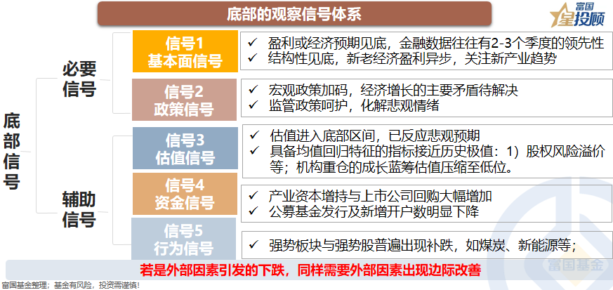 底部都有哪些观测信号?底部信号分为必要信号和辅助信号两种。分类看:其一,辅助信号,当下大多已满足。如,估值信号、资金信号、行为信号;其二,必要信号,依然需要时间来验证结果。如,基本面信号、政策信号。当下, “估值底、盈利底、政策底”的框架依然适用。